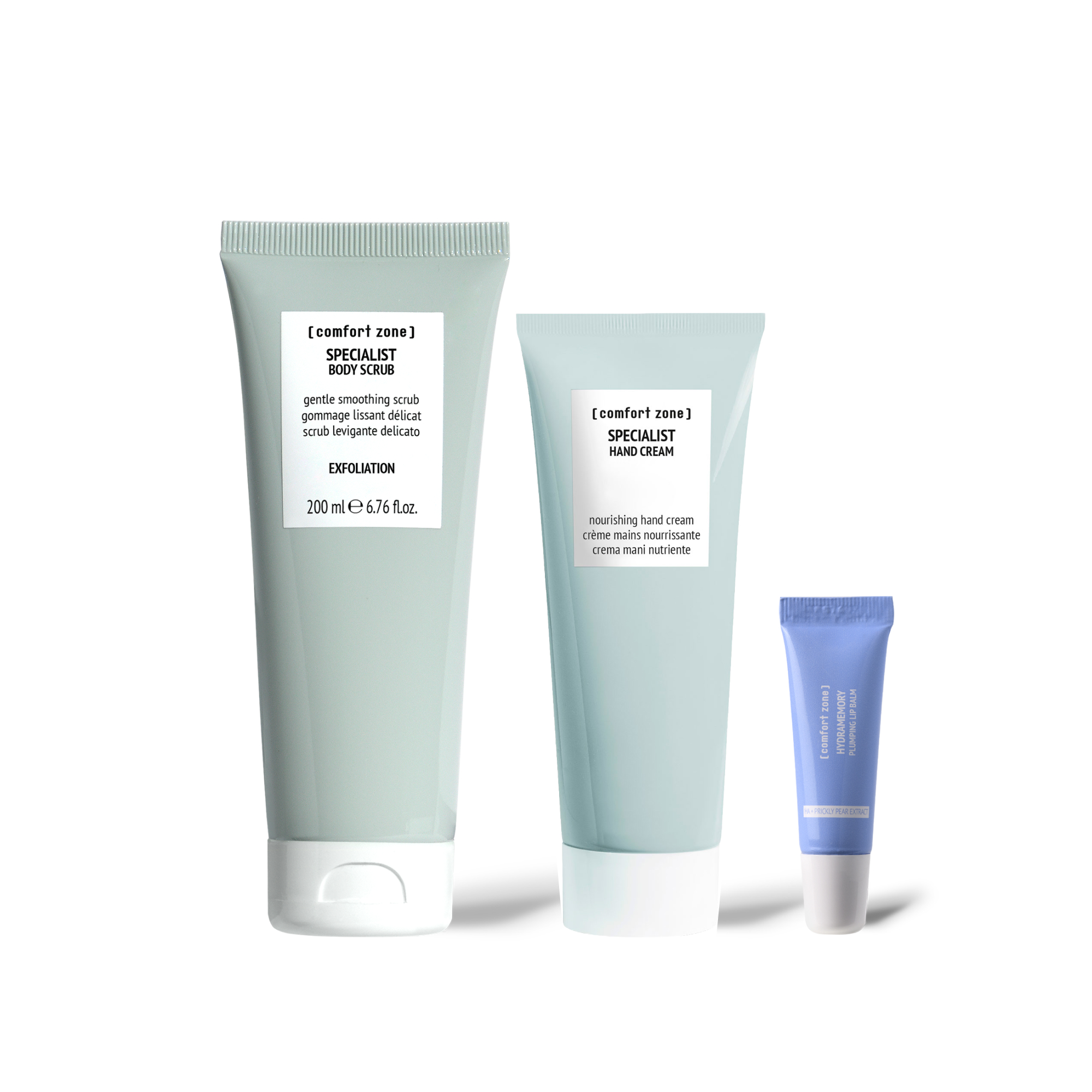 Готовый набор 3-в-1 для ежедневного ухода: три эффективных средства с уникальными формулами решают все основные задачи — увлажнение рук, обновление кожи тела и питание губ. Идеально для дома, путешествий и в качестве подарка.