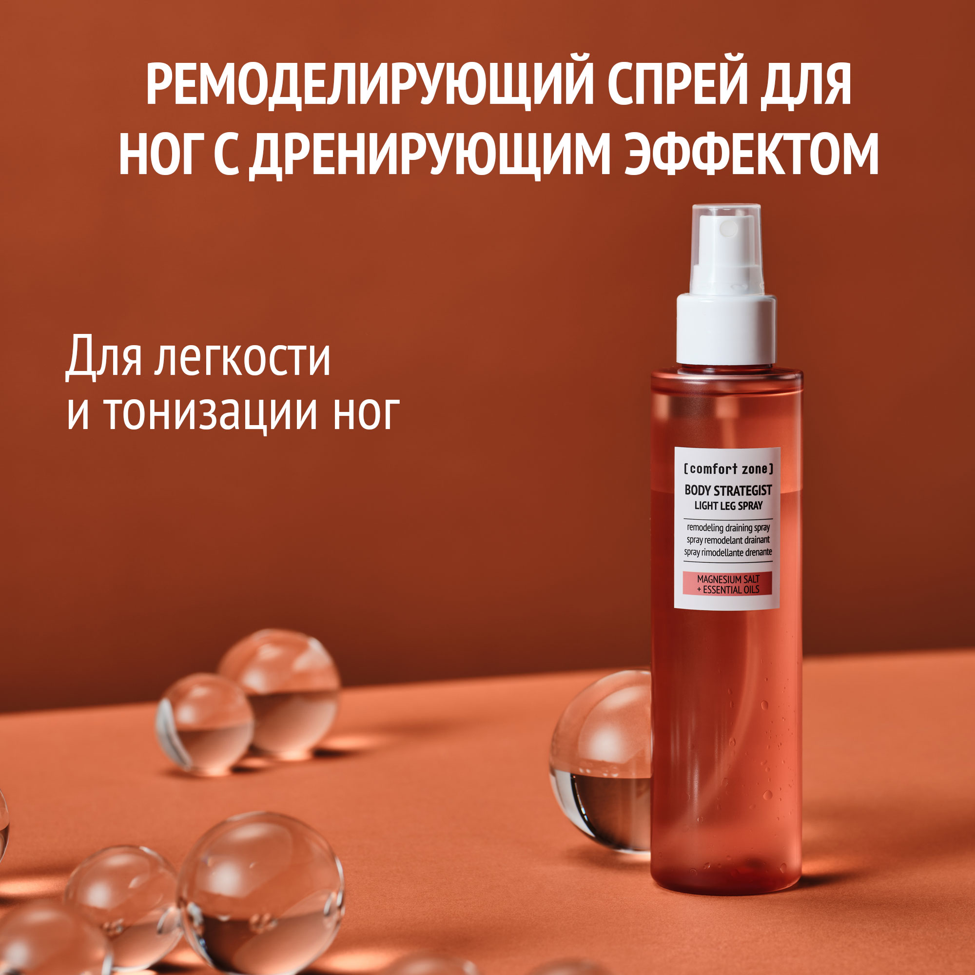 Спрей стимулирует межклеточный обмен и капиллярную микроциркуляцию для борьбы с отеками, отечным целлюлитом и дряблостью кожи.