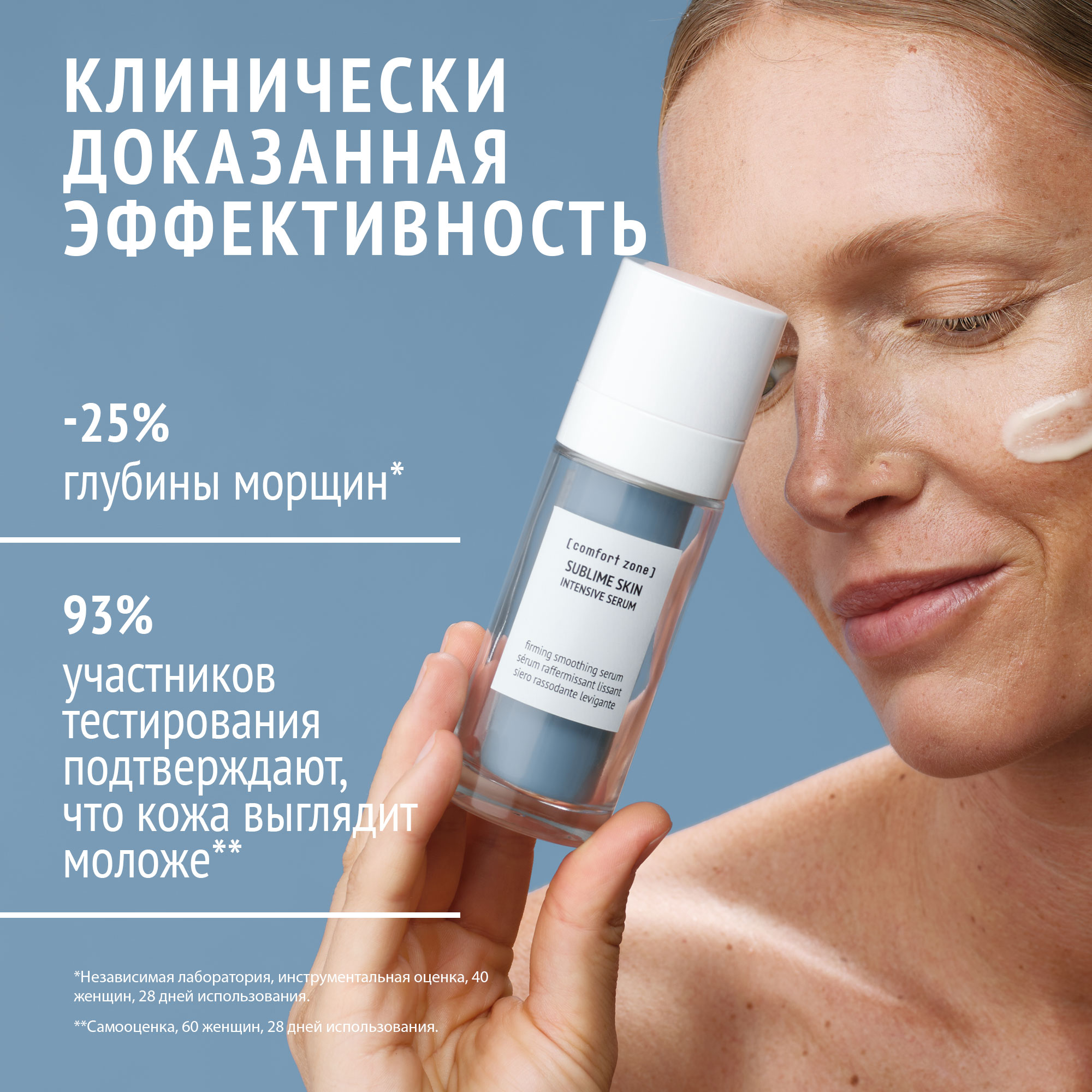 Согласно клиническим испытаниям уже через 28 дней применения сыворотка на 25% уменьшает глубину морщин, придает коже гладкость, упругость и выравнивает текстуру.