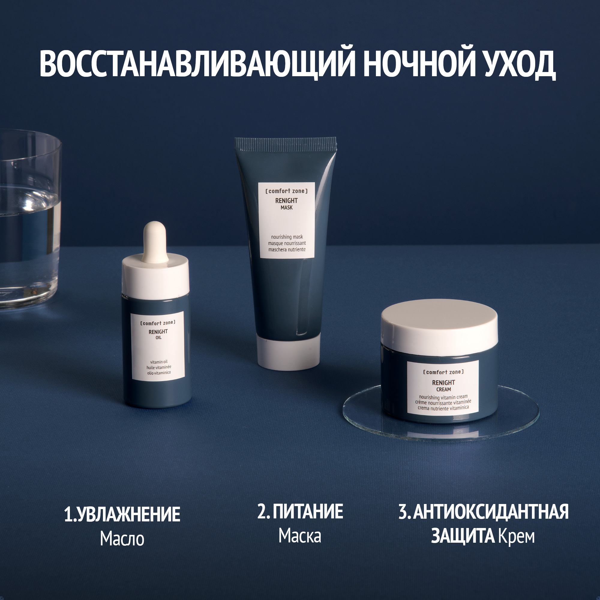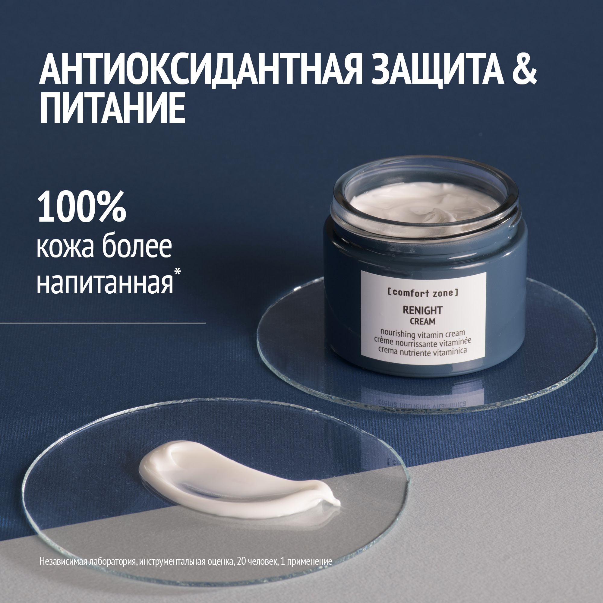 Вечером после очищения наносите на лицо, шею и декольте и делайте массаж до полного впитывания. Для дополнительного питательного и антиоксидантного эффекта добавьте несколько капель масла RENIGHT в крем.