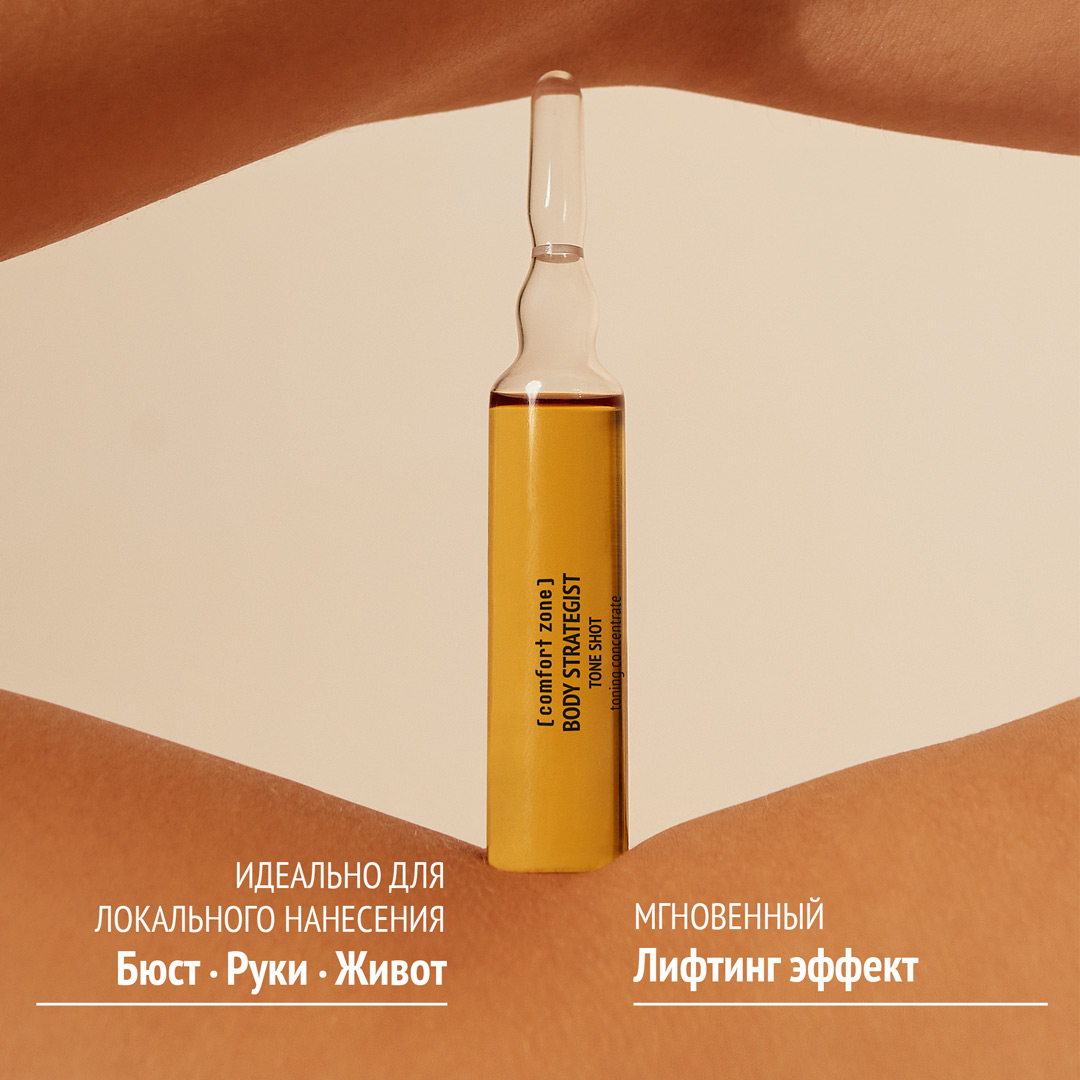 Используйте Тонизирующий концентрат для тела в ампулах BODY STRATEGIST на зонах груди, живота и рук один раз в неделю в течение 4 недель. Массируйте мягкими круговыми движениями до полного впитывания. Завершите процедуру нанесением лифтинг сыворотки для кожи груди BODY STRATEGIST.